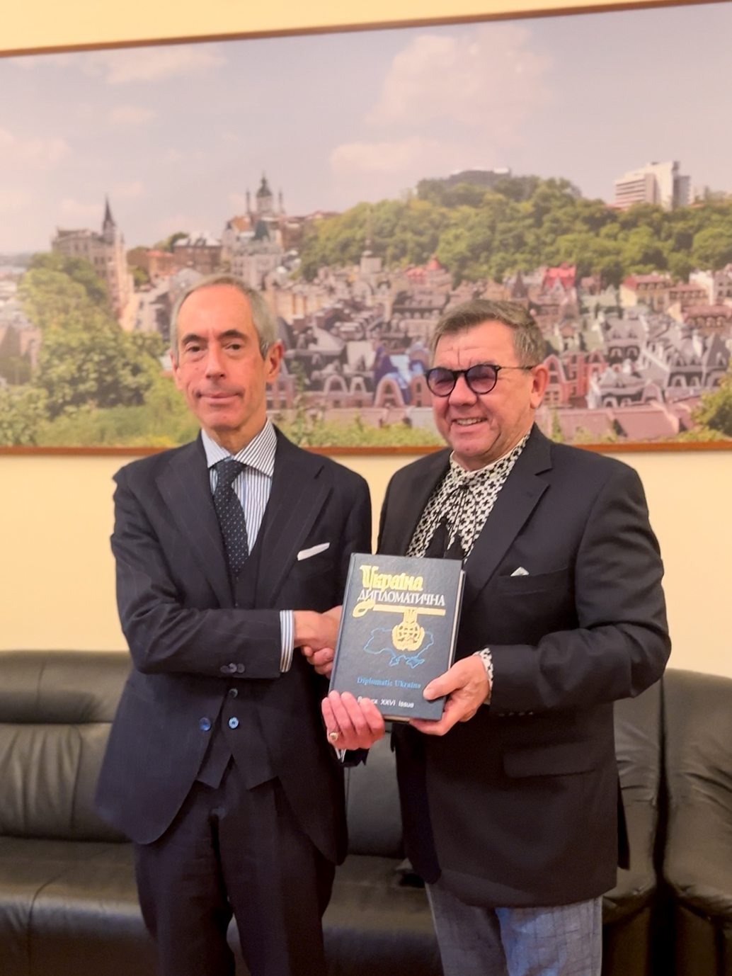 During the meeting, Pavlo Kryvonos thanked the Ambassador for his recent speech at the presentation of the 26th Issue of the Diplomatic Ukraine scientific yearbook and spoke in more detail about this year’s branded printed products, specifically the diplomatic corps daybook and the Square Kilometres of Life calendar project.
