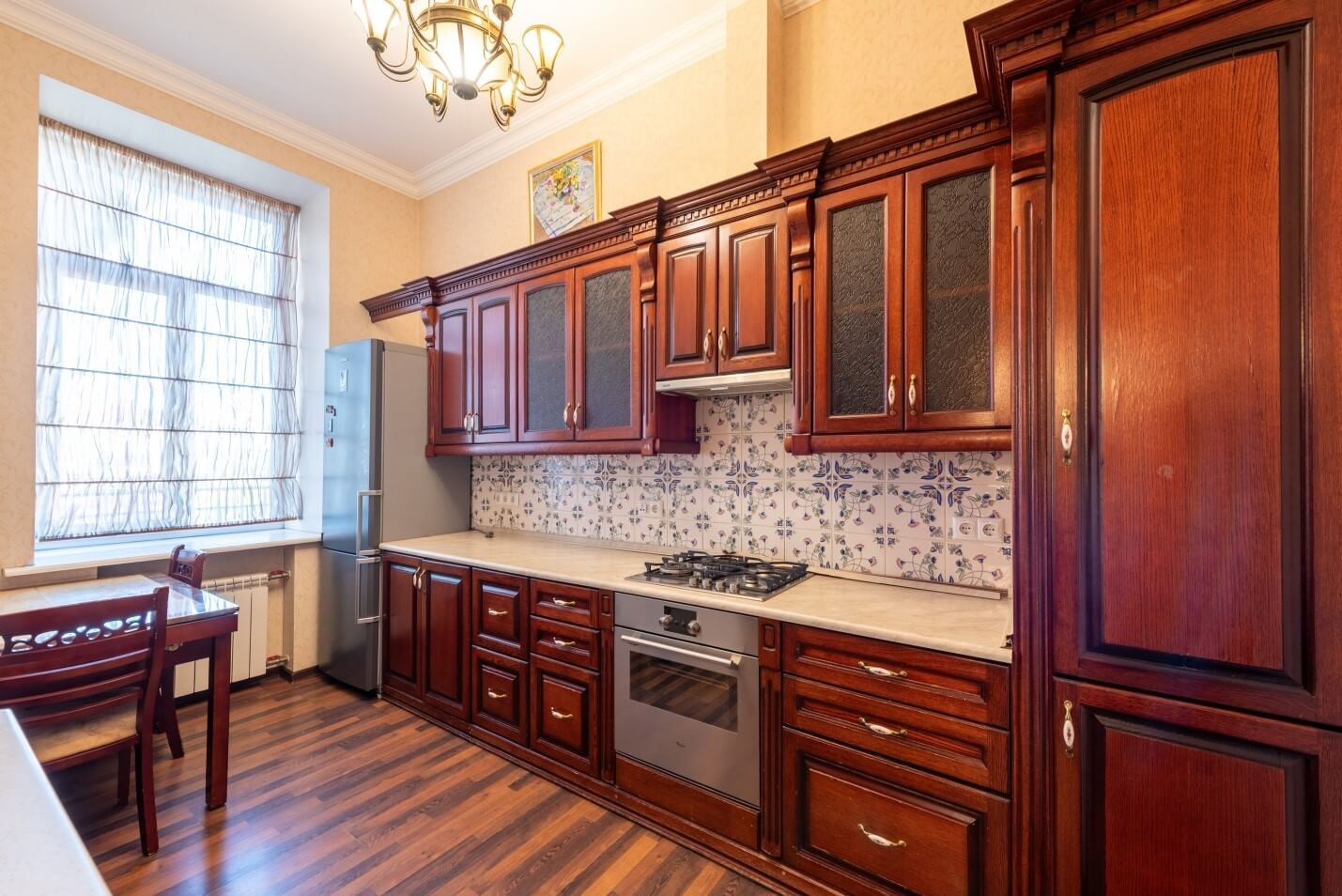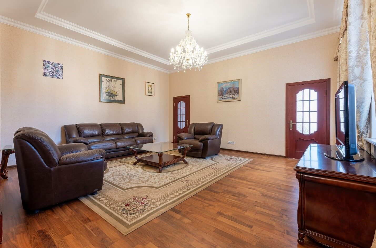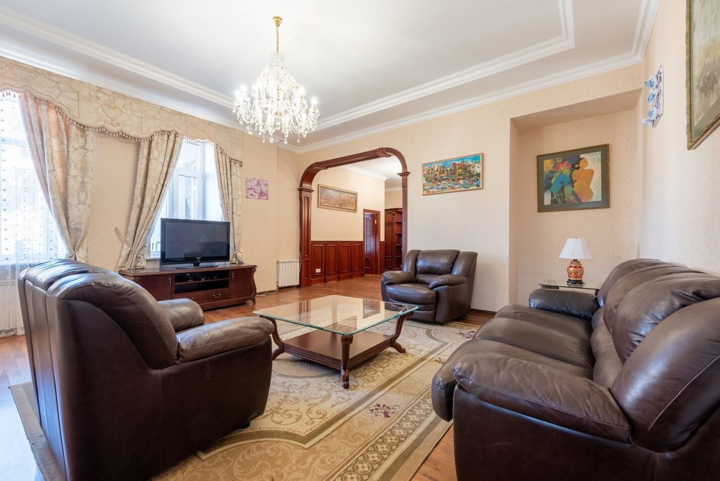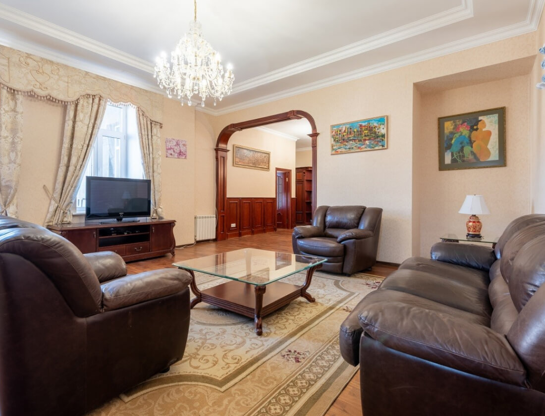 For sale: spacious 4-room apartment with a total area of 127 m² in the very center of the city. The property is located on the 5th floor of a 6-storey building equipped with an elevator. Ceiling height — 3.5 m. There are spacious living room, three separate bedrooms (each with a balcony), a kitchen, large hallway, a bathroom. Fully furnished and equipped with household appliances. Vacant and ready for immediate occupancy.