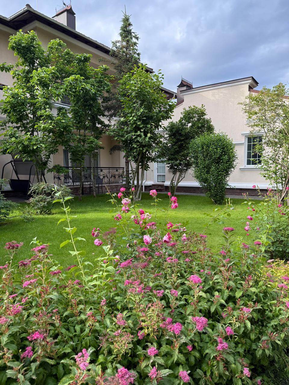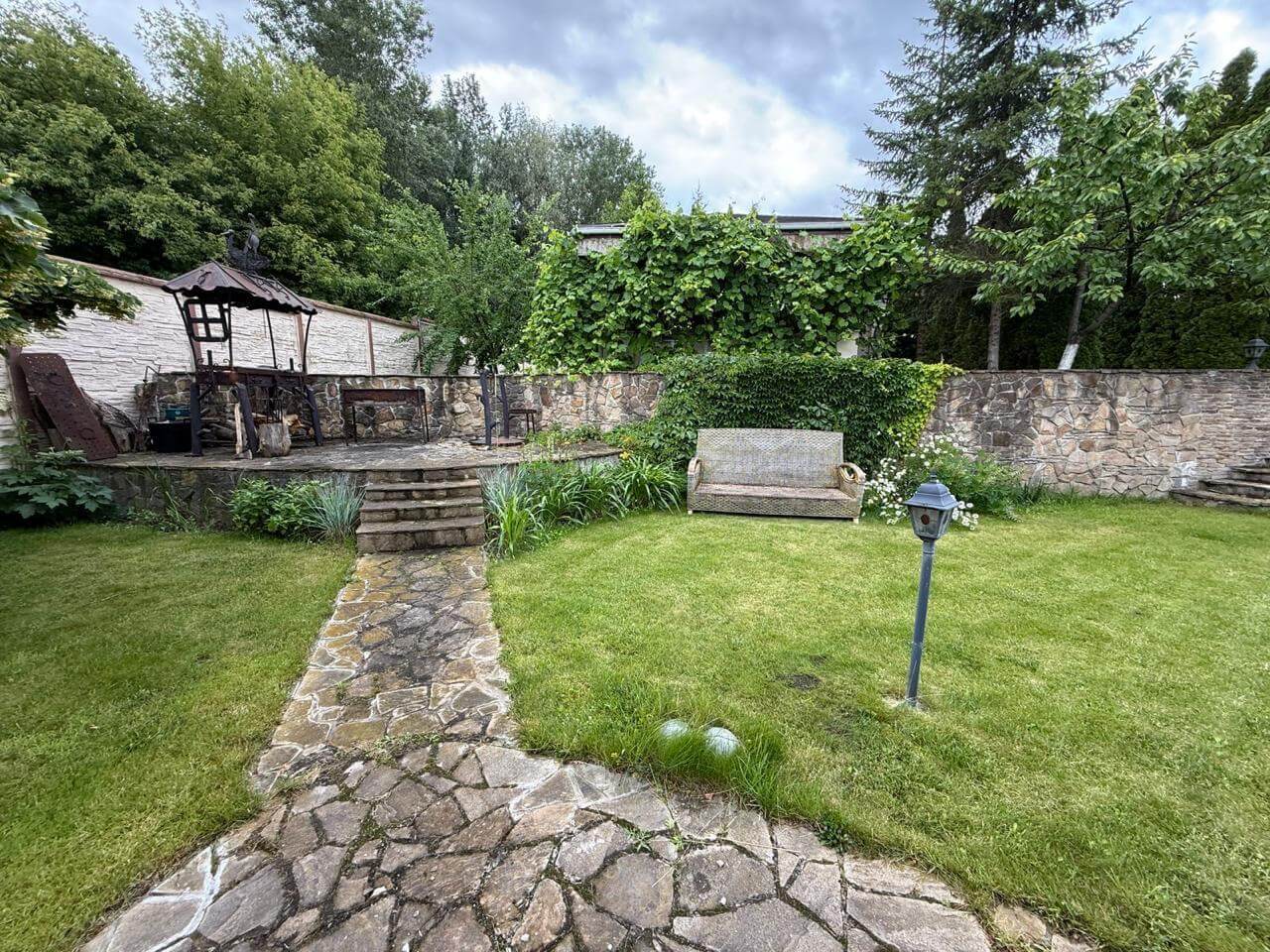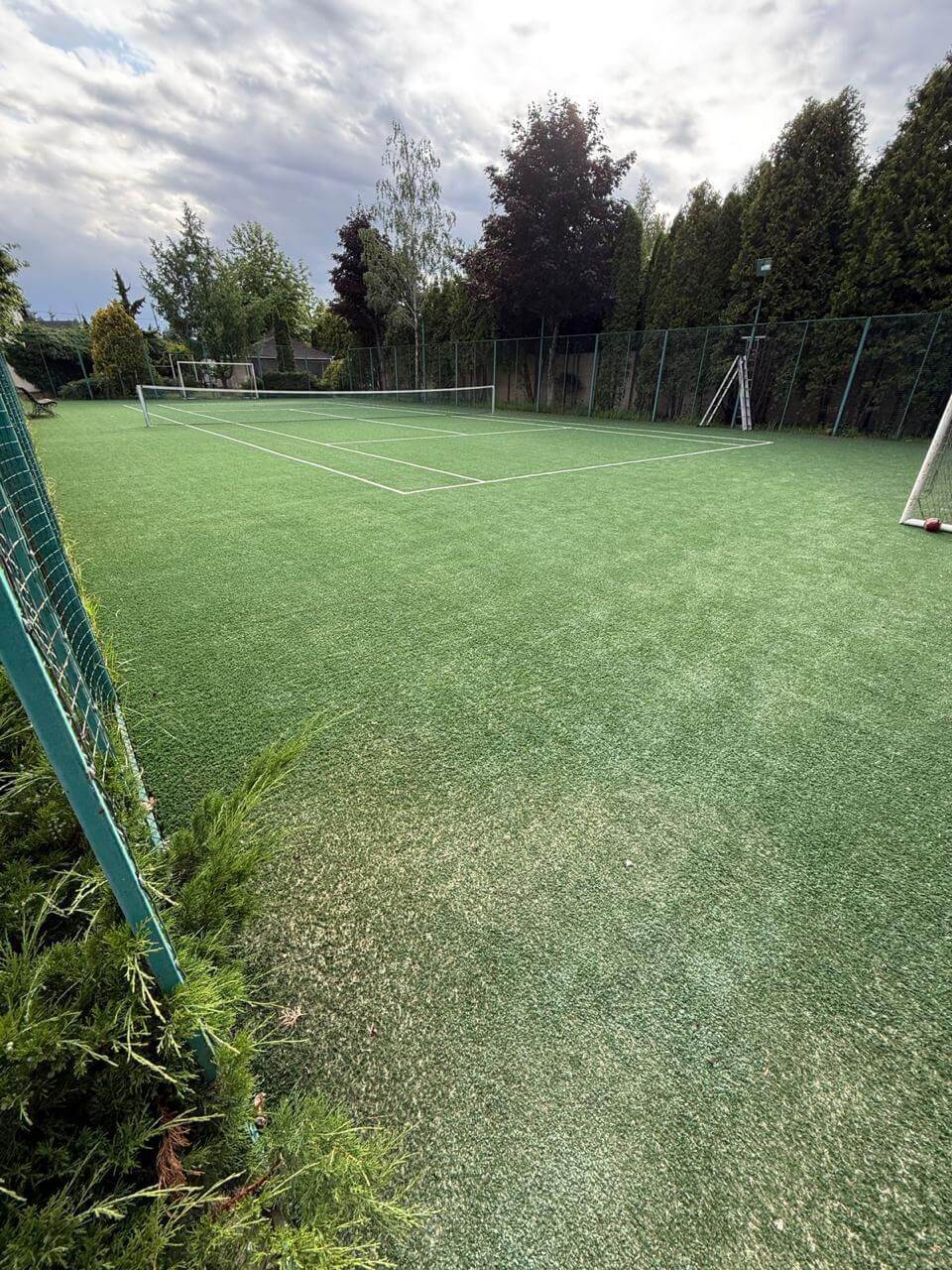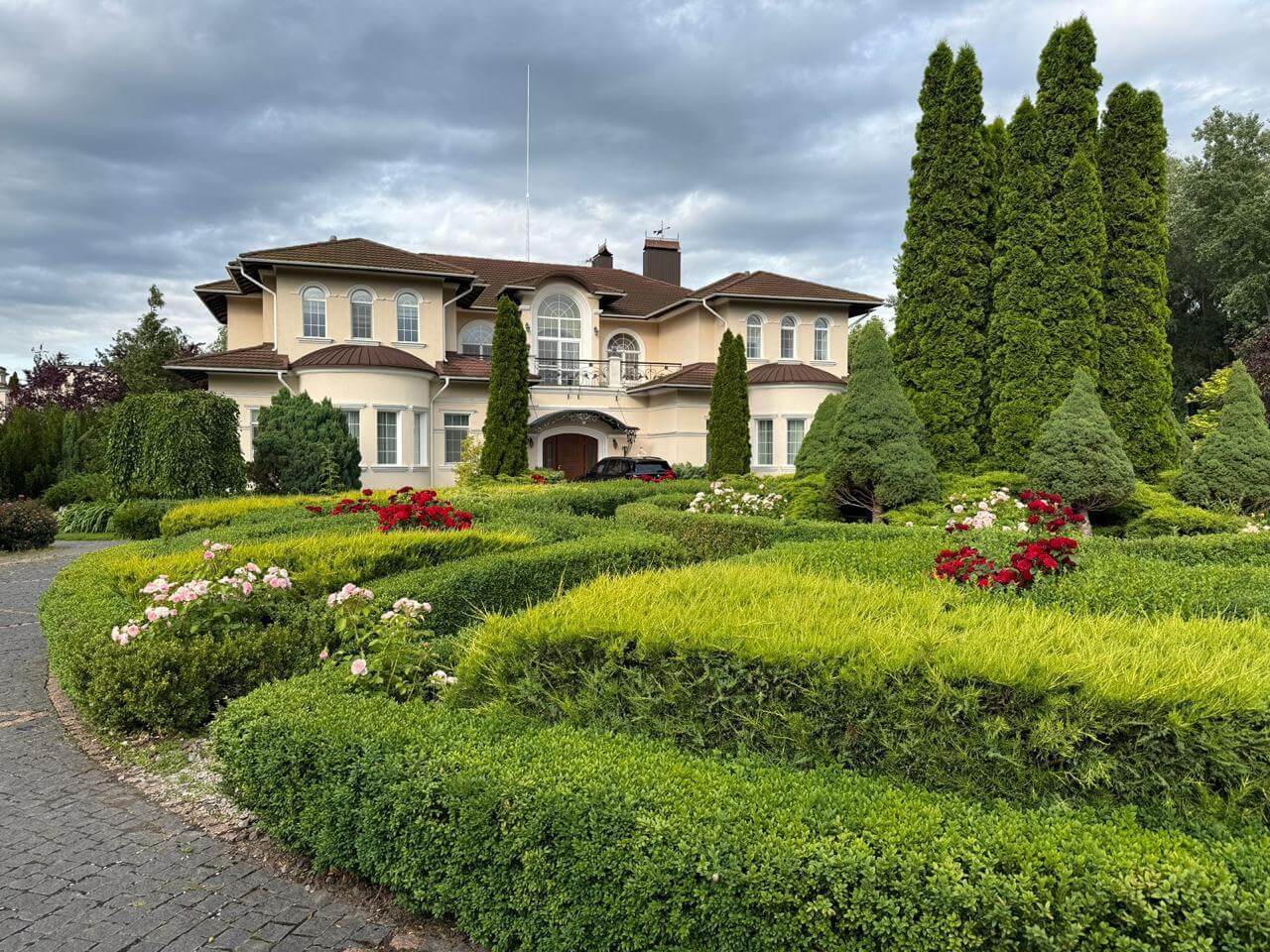 The land plot extends over 1 hectare. The picturesque grounds include an outdoor swimming pool, a bathhouse, a barbecue area, a sports ground suitable for football or tennis, a security house, and a garage for four vehicles. The estate stands within a gated residential community, ensuring a high level of security and privacy.