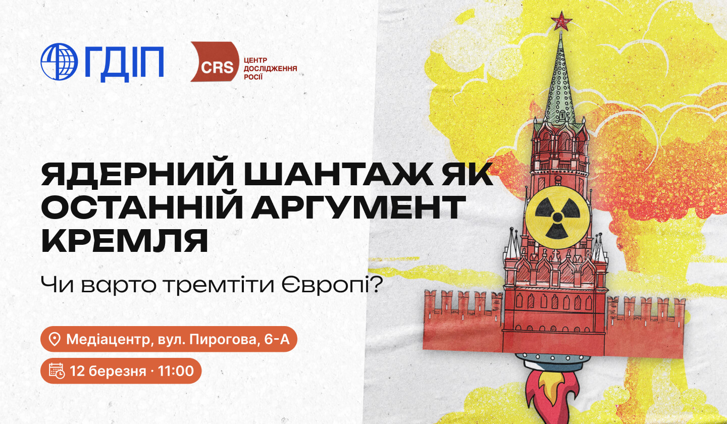 Центр дослідження росії за організаційного сприяння Державного підприємства «Генеральна дирекція з обслуговування іноземних представництв» запрошує вас узяти участь у круглому столі на тему: «Ядерний шантаж як останній аргумент кремля. Чи варто тремтіти Європі?». Подія відбудеться в четвер, 12 березня 2026 року, об 11:00 у Медіацентрі ДП «ГДІП» за адресою: м. Київ, вул. Пирогова, 6-А. Захід матиме комбінований формат: онлайн та офлайн.