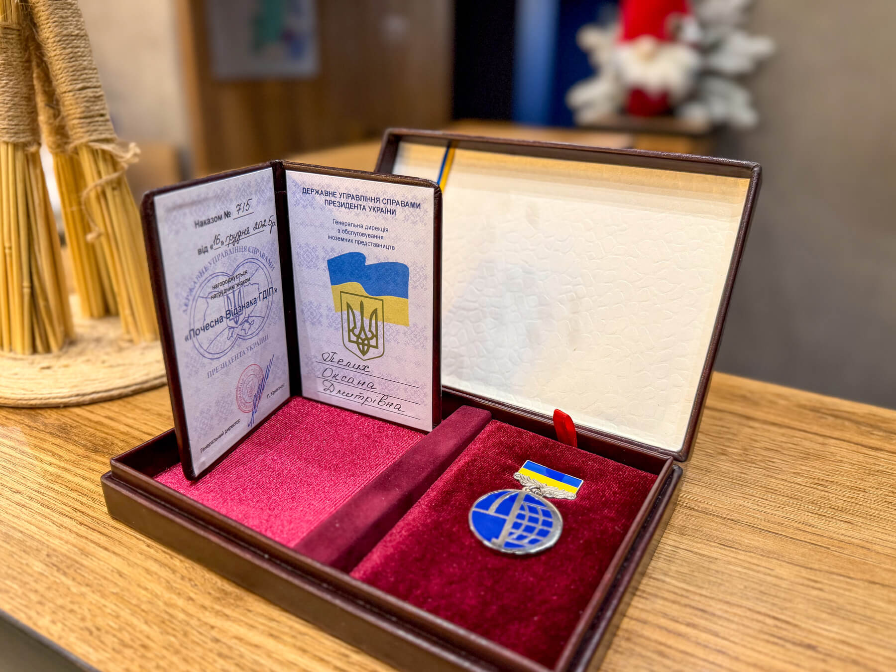 Після пам’ятної хвилини Павло Кривонос вручив почесні відзнаки співробітникам. За значний особистий внесок у справу обслуговування іноземних представництв, зразкове виконання своїх службових обов’язків та високу професійну майстерність Почесну відзнаку ДП «Генеральна дирекція з обслуговування іноземних представництв» було надано начальниці юридичного відділу Керуючої дирекції Оксані Пелих.