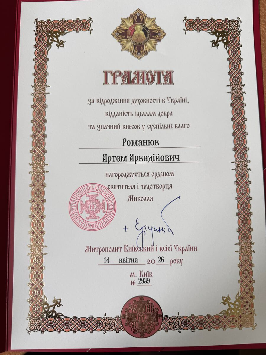 У межах події Настоятель ПЦУ відзначив священнослужителів, захисників України та волонтерів церковними нагородами. Зокрема, за відродження духовності в Україні, відданість ідеалам добра та значний внесок у суспільне благо Грамотою та орденом Святителя і Чудотворця Миколая нагороджено заступника генерального директора ДП «ГДІП» Артема Романюка.
